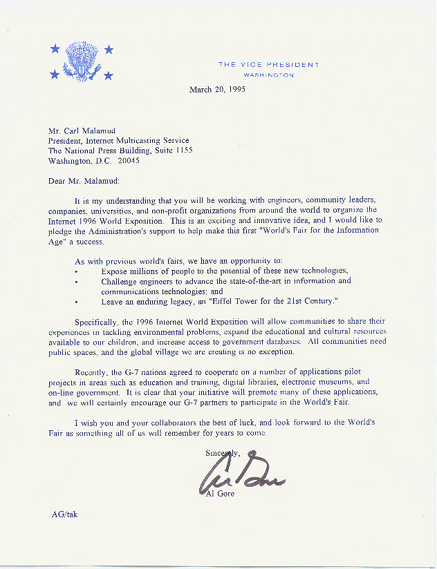 It is my understanding that you will be working with engineers, community leaders, companies, universities, and non-profit organizations from around the world to organize the Internet 1996 World Exposition. This is an exciting and innovative idea, and I would like to pledge the Administration's support to help make this first "World's Fair for the Information Age" a success.