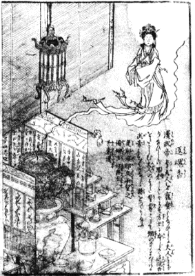 夫人のすがた髣髴として烟の中にあらはる。武帝ますますかなしみ