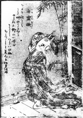 石燕の言う小野小町の話は「広益俗説弁」巻十四にある「小野小町、 草子洗の説」によるようです。小野小町は平安時代の美女で六歌仙の 一人ですが、謎の部分が多くいろいろな伝説ができています。謡曲でも 「鸚鵡小町」や「卒塔婆小町」などいろいろと表現されています。