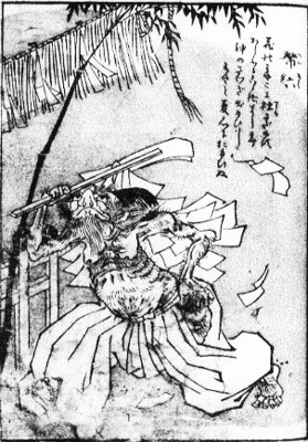 「百鬼夜行絵巻」(真珠庵蔵)では赤鬼が御幣を持って走る姿が