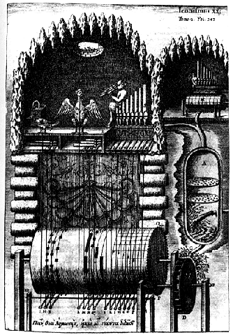 This is the auto playing puppet which Kircher improved. The water wheel on the lower right is the power source for the music box work on the lower left. It moves the puppet which appears to be playing music and the birds seem to be singing along with it. |