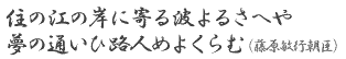 ![]() "Waves approaching me on the shore of Suminoe. I wish you would secretly come to see me in my dream." (Toshiyuki Fujiwara) |