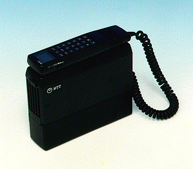 昭和54年から実施されていた自動車電話サービスには、車外でも利用できるようにとの強い要望がありました。NTTはこれに応え、昭和60年(1985)9月18日より、ショルダーホン(車外利用形自動車電話)を登場させました。無線装置部分に送受話の機能を備え、アンテナ、電池を内蔵したもので、車から離れる時にこの車外利用形無線装置を持ち出して、車外から通話することができるようになりました。