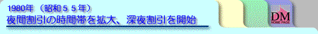 電話利用者の利便を図ると共に、遠距離通話料と近距離通話料との格差是正を図る措置の一環として、昭和55年(1980)、「深夜割引」の実施及び「夜間割引」対象時間の拡大が実施されました。内容は、午後9時から翌日の午前6時までの間「深夜割引」(6割引き)とし、午後7時から午後9時まで及び午前6時から午前8時までを「夜間割引」(4割引き)としました。