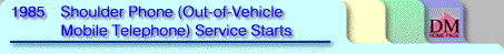 Users of vehicle-based mobile phone service, initiated in 1979, have issued strong demands for a telephone that can be used away from their vehicles. On September 18 1985, NTT responds with the 'Shoulder Phone,' an out-of-vehicle mobile telephone. This new type of phone has a transmitter and receiver, antenna and battery enabling it to communicate with the mobile terminal in the vehicle when used at a distance, allowing callers to use the phone while they are away from their cars.