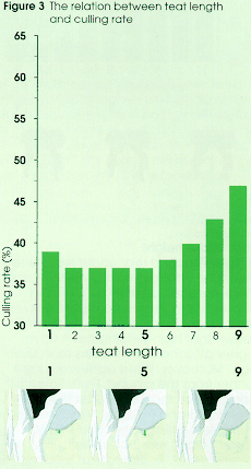 Teat length is given less emphasis than udder depth, teat placement and suspensory ligament in scoring total udder. Teats of about 5 cms length are preferred, which corresponds with a teat length score of 5. Besides the size, the shape of the teats has an effect on the ease of milking. Plumb teats are ideal, whereas pointed, thin teat are less desired in regard to milking speed, especially if teats are longer. Figure 3 indicates that teat length is an optimum trait in regard to herdlife. A teat length score of 9 (very long) is not preferred due to the higher incidence of teat damage.