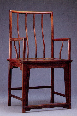 此 椅 在 挺 直 中 略 帶 弧 形 線 條 的 上 部 造 形 , 和 下 部 方 正 的 結 構 相 互 對 照 成 趣 。 整 張 椅 光 素 , 顯 露 自 然 紋 理 ; 上 身 全 用 圓 木 , 採 四 欞 的 木 梳 背 , 空 靈 而 伶 俐 ; 下 身 用 方 材 , 正 面 素 直 券 口 牙 子 加 重 視 覺 的 分 量 , 側 面 是 素 牙 條 , 與 上 身 的 透 空 感 互 有 呼 應 , 腿 部 外 修 圓 角 , 內 側 有 單 稜 線 腳 , 可 見 做 工 考 究 之 處 。