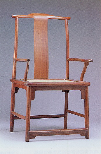 四 出 頭 官 帽 椅 的 椅 背 較 高 , 全 身 淨 素 , 除 扶 手 屜 面 和 踏 腳 棖 之 下 有 簡 單 的 角 牙 之 外 , 連 椅 盤 抹 頭 都 是 混 邊 , 而 聯 幫 棍 也 省 略 了 , 整 體 感 覺 甚 簡 明 , 沒 有 絲 毫 的 累 贅 。