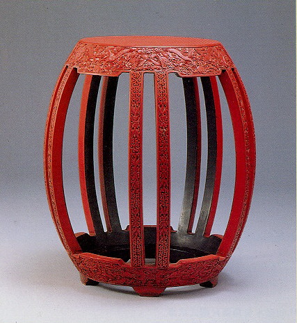 坐 墩 又 名 ? 墩 , 因 常 在 墩 上 常 覆 蓋 錦 織 ? 物 的 墊 子 而 得 名 , 另 一 方 面 , 其 形 似 鼓 , 故 也 稱 為 鼓 墩 。 可 置 於 室 內 戶 外 。 本 件 是 雕 漆 , 內 裡 黑 漆 塗 布 , 顯 然 是 室 內 使 用 的 。 造 形 簡 潔 , 上 下 對 稱 ; 共 有 十 根 彎 條 組 成 彭 壁 , 直 欞 開 光 。 其 表 面 朱 漆 精 雕 有 雲 龍 紋 , 尤 其 坐 面 錦 地 雕 漆 , 刀 法 工 整 , 精 緻 平 直 , 是 清 代 雕 漆 的 特 色 。