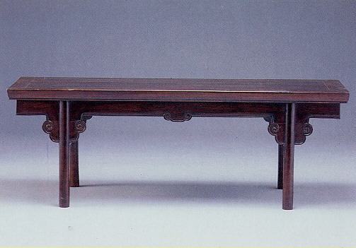 常 見 的 炕 案 形 式 , 以 夾 頭 榫 作 成 。 四 平 木 板 案 面 , 邊 抹 造 出 冰 盤 沿 , 直 形 牙 條 , 起 燈 草 線 腳 , 中 間 有 仰 雲 紋 ; 與 圓 足 相 夾 之 處 的 牙 頭 雕 成 卷 雲 紋 , 圓 腿 足 垂 直 落 地 , 兩 足 間 有 一 根 單 棖 , 造 形 簡 明 , 比 例 悅 目 。 炕 案 的 形 制 與 條 案 、 春 凳 基 本 相 同 , 但 高 度 則 有 不 同 。