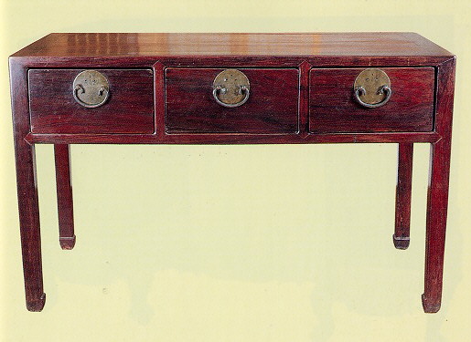 一 般 書 桌 的 形 式 有 三 具 抽 屜 一 字 平 列 , 高 低 相 等 , 容 納 膝 部 活 動 的 空 間 高 度 也 是 一 致 的 。 書 桌 面 深 都 在 二 尺 半 左 右 才 夠 牘 案 展 讀 書 寫 和 放 置 文 具 之 用 , 腿 足 從 桌 面 四 腳 落 地 帶 小 馬 蹄 , 無 橫 棖 亦 無 腳 踏 , 形 式 較 古 。 整 張 書 桌 造 形 簡 單 明 瞭 , 毫 無 雕 飾 ; 因 此 抽 屜 面 板 的 正 圓 光 素 面 白 銅 葉 片 拉 手 , 成 為 視 覺 注 目 的 所 在 , 與 整 張 桌 形 成 巧 妙 的 搭 配 , 甚 為 沉 著 安 靜 。
