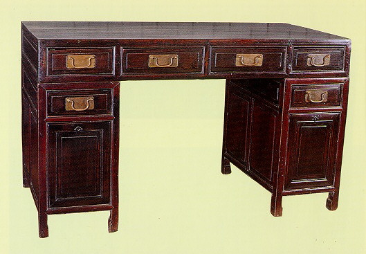 書 桌 採 用 架 几 的 形 式 , 則 桌 面 較 寬 大 且 深 , 甚 至 可 供 兩 人 對 坐 共 同 使 用 。 架 几 成 箱 形 , 置 有 抽 屜 於 箱 几 之 上 , 下 方 為 扇 頁 門 , 可 供 橫 置 卷 軸 字 畫 或 函 裝 套 書 , 抽 取 存 放 均 相 當 方 便 。 桌 面 亦 成 一 箱 式 搭 板 , 有 四 屜 , 落 放 在 左 右 箱 几 上 即 成 大 書 桌 , 造 形 均 方 整 。 抽 屜 面 板 中 間 陽 起 是 唯 一 的 裝 飾 , 側 面 面 板 以 板 材 嵌 入 , 結 構 分 明 , 雖 為 清 製 但 有 明 式 桌 具 的 簡 潔 之 美 。 長 形 銅 葉 拉 手 應 是 重 補 的 附 件 。