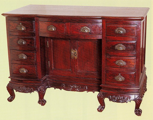 很 明 顯 的 是 受 到 十 八 世 紀 中 期 歐 洲 箱 框 形 結 構 家 具 的 影 響 而 發 展 出 來 的 中 國 家 具 , 此 時 法 國 路 易 十 四 風 格 的 家 具 是 西 方 主 要 潮 流 , 流 行 的 立 櫃 、 寫 字 檯 多 採 獅 爪 的 彎 腿 , 箱 與 箱 之 間 , 或 身 與 腳 之 間 , 以 雙 盤 沿 大 窪 線 腳 ( 如 束 腰 ) 分 段 , 腿 足 與 牙 條 迎 面 有 花 紋 浮 雕 , 並 有 大 的 弧 形 曲 線 俱 為 特 色 。 本 件 應 是 乾 隆 年 間 上 海 一 帶 的 作 工 , 書 桌 前 緣 與 抽 屜 面 均 為 弧 形 , 中 間 內 陷 成 一 暗 門 箱 , 盤 沿 之 下 即 是 有 雕 飾 的 牙 條 和 八 支 獅 爪 三 彎 腿 , 與 路 易 十 四 時 期 寫 字 桌 的 風 格 相 當 類 似 。 金 銅 葉 片 拉 手 是 乾 隆 以 後 的 造 形 。