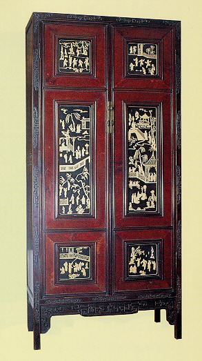 櫃 頂 無 櫃 帽 而 成 方 方 正 正 的 立 櫃 稱 為 方 角 櫃 。 本 件 屬 於 中 等 大 小 的 方 角 櫃 , 身 裁 高 瘦 所 以 看 起 來 挺 拔 , 比 例 頗 佳 。 做 工 與 紋 飾 變 化 多 且 線 條 硬 直 , 均 可 看 出 清 式 的 風 格 。 櫃 門 是 無 閂 杆 的 硬 擠 門 , 攢 框 三 截 構 成 , 每 截 版 心 嵌 入 海 象 牙 雕 紅 樓 夢 人 物 故 事 , 寫 景 有 趣 , 是 整 件 櫃 子 的 重 心 , 其 邊 正 如 畫 加 邊 框 , 加 強 畫 面 的 效 果 ; 此 框 外 以 櫻 木 板 貼 面 , 色 澤 與 紋 裡 頗 美 ; 整 體 而 言 雖 繁 複 但 不 俗 麗 。 此 櫃 更 特 殊 的 是 , 櫃 門 的 裡 面 竟 也 佈 滿 海 象 牙 刻 的 篆 字 吉 祥 祝 語 , 黑 底 白 字 甚 為 醒 目 , 是 仕 宦 人 家 風 雅 細 緻 的 上 好 家 具 。