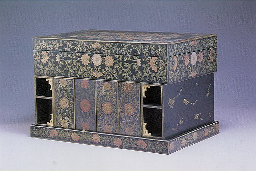這 是 一 件 各 部 位 都 可 拆 開 組 合 的 多 寶 格 箱 , 蓋 和 底 蓋 也 可 以 互 相 對 調 , 箱 內 有 六 個 屜 箱 也 都 可 以 或 直 或 橫 的 放 著 , 端 視 藏 放 文 物 珍 寶 的 大 小 形 狀 等 性 質 來 組 合 , 滿 足 不 同 的 需 求 。 為 便 於 組 合 其 尺 寸 考 慮 到 搭 配 的 可 能 性 , 連 箱 面 所 繪 的 纏 蓮 八 寶 紋 亦 要 能 夠 連 接 , 製 作 箱 體 的 板 料 質 輕 , 易 於 搬 動 。 漆 色 暗 黑 泛 寶 藍 光 的 紫 漆 為 底 , 上 面 描 金 彩 繪 與 佛 教 有 關 的 花 飾 , 因 此 可 能 是 供 存 放 與 佛 經 、 小 金 銅 佛 像 和 禮 具 等 類 的 貴 重 寶 物 。