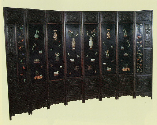 從 裝 飾 而 言 , 圍 屏 有 很 多 是 木 胎 髹 漆 的 。 清 中 葉 以 後 製 的 , 則 有 描 金 、 彩 漆 、 彩 油 、 填 漆 鎗 金 、 嵌 螺 鈿 、 百 寶 嵌 等 多 種 造 法 。 清 代 黑 漆 百 寶 嵌 屏 風 至 今 仍 被 玩 家 喜 愛 收 藏 。