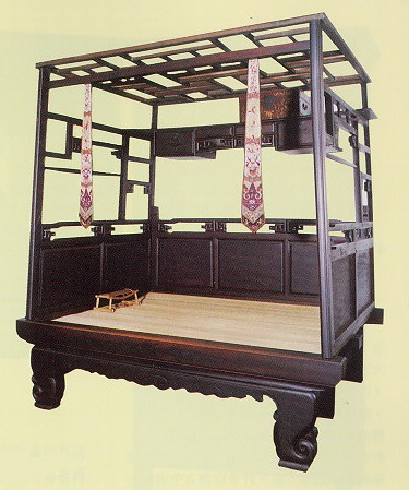 台 灣 民 間 把 睡 用 的 大 床 通 稱 為 紅 眠 床 , 因 多 漆 以 朱 紅 色 而 名 之 , 即 所 謂 的 架 子 床 , 基 本 形 式 即 床 的 三 面 有 圍 , 四 角 立 柱 , 上 有 頂 棚 , 頂 下 四 周 通 常 還 有 橫 楣 , 大 陸 南 方 因 它 有 柱 四 根 而 稱 為 四 柱 床 。 但 台 灣 一 般 說 是 八 腳 眠 床 , 八 腳 的 意 思 有 二 義 : 一 是 指 其 床 底 架 的 結 構 共 有 八 根 腳 , 即 二 組 床 架 組 合 而 成 ; 另 一 說 法 是 指 除 四 面 圍 之 外 , 還 要 有 罩 在 其 外 的 花 罩 而 形 成 完 整 的 方 形 結 構 , 則 內 架 外 罩 共 有 八 根 立 柱 的 關 係 而 稱 為 八 腳 眠 床 , 是 較 考 究 的 作 法 。