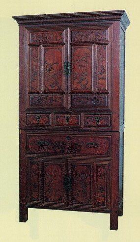 通 常 南 方 所 稱 的 櫥 , 即 是 北 方 的 所 謂 櫃 ; 所 以 今 又 就 通 稱 帶 有 門 扇 頁 形 式 的 儲 物 家 具 為 櫥 櫃 。 北 方 多 用 以 藏 書 帙 , 而 南 方 則 有 存 放 書 冊 、 衣 物 的 用 法 , 所 以 除 了 櫃 門 之 外 , 漸 發 展 兼 設 抽 屜 的 樣 式 , 以 適 應 多 種 使 用 功 能 的 要 求 。 本 件 是 由 頂 櫃 和 下 櫃 兩 部 分 組 合 而 成 , 可 分 可 合 著 使 用 , 角 柱 上 下 垂 直 , 門 扇 或 抽 屜 間 的 立 柱 和 門 扇 鑲 攢 的 邊 櫃 均 打 窪 線 腳 , 增 加 視 覺 上 層 次 的 美 感 , 通 體 比 例 頗 佳 而 硬 朗 挺 拔 ; 從 櫥 頂 部 的 櫃 帽 可 以 看 出 受 西 方 家 具 裝 飾 的 影 響 。 製 作 年 代 約 已 七 十 年 左 右 , 做 工 嚴 謹 , 保 存 良 好 。 屜 面 和 門 扇 均 墨 繪 花 鳥 , 原 來 有 部 份 花 葉 以 彩 色 漆 繪 , 已 褪 色 不 少 , 益 增 古 意 。