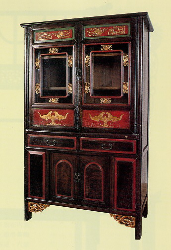 家 具 的 用 料 做 工 通 常 都 很 考 究 , 目 的 是 既 可 經 久 耐 用 , 甚 至 傳 之 後 代 子 孫 , 再 則 可 以 襯 托 家 風 品 味 和 主 人 的 修 養 , 所 以 求 精 求 美 。 明 式 家 具 的 美 是 含 蓄 圓 潤 , 而 清 式 家 具 則 在 繁 縟 華 麗 。 本 件 功 能 是 當 做 書 櫥 , 以 存 放 聖 賢 書 頻 如 玉 或 般 若 經 卷 以 滌 凡 塵 , 但 甚 少 如 此 濃 妍 奢 華 的 書 櫥 , 既 錯 彩 鏤 金 , 又 裝 添 許 多 單 薄 材 料 的 鏤 花 雕 片 來 錦 上 添 花 , 這 種 美 是 俗 麗 的 , 更 在 視 覺 上 造 成 不 安 定 的 感 覺 , 有 違 讀 書 人 定 靜 的 養 性 修 為 。 從 門 扇 的 飾 件 和 腳 座 角 牙 鑲 花 , 很 明 顯 的 可 以 看 出 是 以 室 內 門 隔 屏 扇 裝 折 的 部 份 , 重 新 組 合 重 漆 的 舊 料 新 做 。 可 以 當 做 參 考 展 示 品 , 以 供 比 較 對 照 。