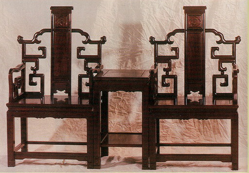 本 組 保 持 高 靠 背 官 帽 式 椅 的 基 本 形 式 , 在 風 格 上 可 視 為 蘇 州 式 椅 的 變 化 再 加 新 意 , 也 是 配 合 現 代 起 居 的 方 式 調 整 尺 寸 。 靠 背 高 出 拱 起 的 托 首 處 甚 多 , 並 雕 琴 把 的 卷 軸 頭 , 形 窄 而 直 以 三 段 攢 板 鑲 成 , 上 雕 雲 紋 , 中 段 光 素 , 下 鎪 亮 腳 , 感 覺 很 強 烈 ; 搭 臘 出 頭 昂 起 ; 上 段 椅 腳 角 牙 成 直 角 轉 折 回 紋 , 其 紋 飾 處 理 與 扶 手 類 似 的 一 體 處 理 。