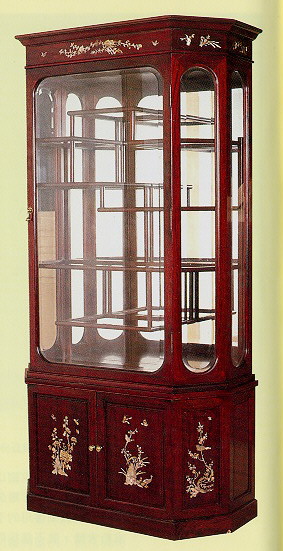 古 董 櫥 即 是 收 藏 陳 列 古 玩 的 多 寶 格 架 , 下 為 櫃 上 為 亮 格 。 其 實 本 件 櫥 櫃 除 鑲 螺 甸 的 題 材 和 作 工 帶 有 傳 統 的 味 道 之 外 , 整 體 造 形 是 西 方 式 的 , 尤 其 櫃 子 是 來 自 西 方 的 箱 形 結 構 , 並 把 兩 側 做 斜 面 。 為 與 現 代 客 廳 配 合 , 並 保 護 文 物 安 全 , 而 裝 上 玻 璃 頗 為 實 用 。 不 過 玻 璃 邊 框 圓 弧 轉 角 的 設 計 , 與 其 他 部 位 直 線 性 的 造 形 互 有 干 戈 , 是 美 中 不 足 的 地 方 。