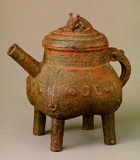 This spouted vessel with lobed body has four cylindrical legs. The unusual cover is in the form of a coiled dragon in high relief. The handle opposite the spout is surmounted by an animal mask. The entire surface of the body and spout is decorated with k'uei-dragons and animal masks.