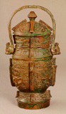 The yu vessel type is mentioned in the Shu Ching, the Shih Ching (Book of Odes), and the Tso Chuan, as a container for spiced wine. The present vessel is roughly cylindrical and quite tall, unlike the more squat and rounded shape of the typical yu vessel. The vertical flanges below the handle-ends bisect the two animal masks that constitute the main decoration of the piece. The two smaller bands on the body, and on the lower part of the lid, contain various sorts of dragons. The motifs are all executed in high relief on a lei-wen ground. The forceful high-relief, flanges and articulate form are all typical of late 8hang bronzes. The one-graph inscription is probably the clan emblem of the vessel's owner.