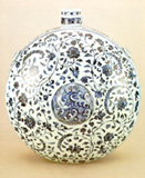 Underglaze-blue porcelain, also called blue-and-white ware, was produced through furnace transmutation of cobalt pigment. Early Ming blue-and-white used a cobalt-blue pigment from Southeast Asia, which produced a vivid blue color and lively designs. This vessel is entirely decorated with floral designs. The effect is rich and elegant.
