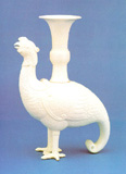 This tsun mounted on the back of a fowl is imitative of archaic bronze wine vessels. The tsun portion is ornamented in cleanly-incised k'uei dragon motives, with stylized blades of design decorating the throat and base. The feathers and the claws of the bird are carved in low relief. The piece as a whole presents a delightful composite of stately archaic form, stylized animal features combined with more realistic elements.