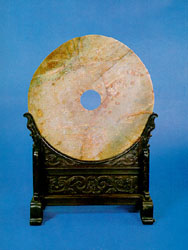 The pi is a circular disk with a round orifice in the center. Its dimensions can vary greatly, and it has had various uses over the years. The smaller variety may have been used as jewelry or decorative ornaments. The larger ones were probably used as a symbol of power, position, and wealth. The pi may also have been used as currency or had a function similar to that of currency. It is likely that this appealing form originally represented the Chinese idea, "round like heaven," and was used as a ritual object in worshipping gods and ancestors.