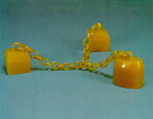 Yellow jade is a rarity. The purity and uniformity of the yellow color make these objects extremely precious. A jade piece has been carved into three seals, two of square shape and one oval; all three possess an attached ring connected by jade chains, and joined at the. end by a single large ring.