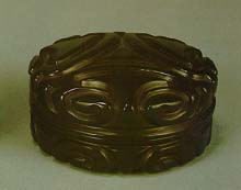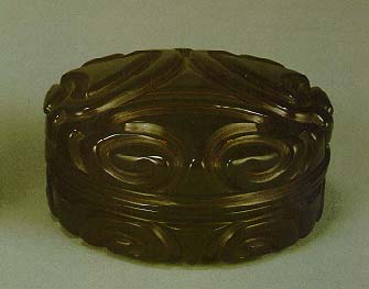 This cylindrical box with a level top is covered in its entirety with a thick layer of black lacquer and has three identical patterns of cloud decor slant-carved into both the cover and the body. The design is graceful with rounded edges, and the lacquer is bright and lustrous. The inner edges of the designs reveal two very fine layers of red lacquer, like two pieces of red silk thread winding their way around in a sea of black. The Record of Decorative Lacquer (Hsiu Shih Lu) refers to this style as, "Vermilion thread in raven black," a technique quite popular in the Sung (A.D. 960--1279) and Yuan dynasties.