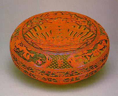 This round covered polychrome box is coated with seven different shades of lacquer. Carved on the cover is the character "Spring" (ch'un). The top part of this character is decorated with an image of the God of Longevity and on each side there are dragon and cloud patterns, while beneath there are symbolic treasures. The outside walls of the vessel are decorated with landscapes and human figures contained in four medallions. In between the medallions there are emblems of the "Eight Treasures." On the center of the underside is a six-character Ch'ien4ung reign mark and a four-character inscription "Ch'un-shou pao ho."