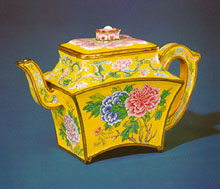 The body of this piece is square, with broad sloping shoulders and smaller base and cover. A peony decor in polychrome enamels is set against a yellow background. On the base in red regular script is inscribed the K'ang-hsi reign-mark.