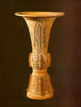 This exquisitely carved vessel was done in imitation of a similar bronze wine vessel with animal mask motif from the late Shang or early Western Chou dynasties (13th - 101h cent. B.C.). Four evenly spaced vertical ridges run from top to bottom. The neck is adorned with plantain leaf and k'uei-dragon and animal mask motifs adorn the unusually tall base. A cloud and thunder diaper pattern provides the ground for all of these decorations. These are small fissures at places on the neck, the waist, and the everted mouth, indicating that the bamboo sections were first carved, then joined together.