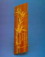 This piece is rectangular, with a curved back and divided into two vertical sections. On the surface is carved in relief a spray of bamboo leaves and a poem in four-syllable verses, followed by the carver's name (Chung-yin-pan-shan) and two carved seal-impressions.