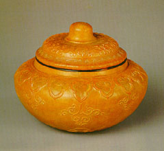 This object is a squat and round gourd jar covered with cloud and Indian-lotus patterns; the under-side has a four-character Kang-hsi reign-mark. The shape and decoration were obtained by growing the gourd in a carved mold.