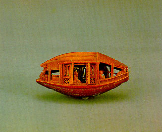 A tiny boat carved from an olive stone is fully equipped with a covered deck and moveable windows carved in open-work. The interior has chairs, dishes on a table and eight figures representing the characters from Su Tung-po's "Ode on the Red Cliff." On the underside carved in minute characters is the entire ode, the date and the artist's name.