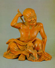 A seated Lohan figure scratching his back while a little dog jumps onto his lap. The expression of satisfaction on his face and the naturalistic treatment of this small graceful piece of sculpture are impeccably achieved by the artist.