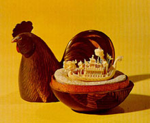 The boat is in the shape of a dragon. On the deck is a three-storied structure, with balustrades and balconies. There are also sixteen flagstaffs and a single parasol at the top, all carved with utmost refinement. The boat is kept in a gold-painted lacquer box in the shape of a rooster.