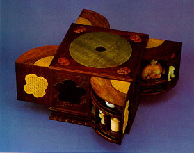 This red sandalwood box is composed of four separate compartments which revolve outward when pushed from the opposite side. These are decorated in a folding-fan motif. The top of the case is inlaid with a pi-disk in mottled dark green jade. The piece contains 20 miniature treasures.