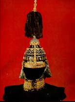 Used by the Ch'ien-lung emperor (A.D. 1736 1795), this helmet is made of black lacquered leather and decorated with Buddhist invocations in gold Sanskrit characters, embroidered dragon motifs, and sable fur, pearls and precious stones in a variety of colors.