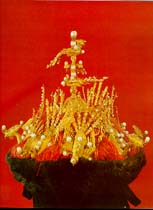 Made of smoky-sable fur with a red top, this winter crown is richly decorated with golden phoenixes, pearls and precious stones. It is a good example of the sumptuous apparel of the imperial consorts during the late Ch'ing period.