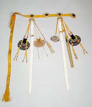 This group includes a hairpin in the shape of a bat (20.2 cm long), one in the shape of a chry-santhemum-blossom (i4.3 cm long), and one in tire shape of a flower made from small pearls (14.5 cm long). These hairpins are constructed of various carved semi-precious stones, including coral and jade.