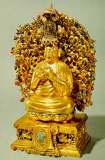 A golden image of the Buddha inlaid with jewels. The figure is dignified in appearance, seated in lotus position, a pearl set in the middle of his forehead. His hands make the gesture of preaching, known in Sanskrit as the dharmacakra-mudra. Behind the figure is a tree whose branches spread out to form a large mandala on which many small gods appear. The throne of the Buddha and the mandala are inlaid with gems of various colors. An inscription on the back indicates that this image was made in A.D. 1781 as a replica of a gold Buddha-image from Tibet.