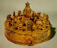 Round, drum-shaped mandala with free ring handle on the side and hollow interior. The top surface is engraved with wave patterns. In the center stands Mount Sumeru surrounded in three con-centric circles by the Seven Jewels or Precious Articles of Royalty, the Eight Buddhist Emblems, and, on the outer edge, small shrines and earthly things. The side of the mandala is decorated with Indian lotuses and the Eight Emblems in low relief. Above the lotus decor is a band inlaid with colored stones, and below it is a row of cloud patterns. The mandala is a cosmic diagram; this particular one represents Jambudvipa, the southern continent.