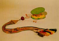Hand-drum made from the skull-tops of a boy and a girl joined together at the tops and covered with lamb or monkey skin. The skin is dyed green and is decorated with a fine-line drawing of a dragon. Gilt ornaments are fixed to the edges of the skin and inlaid with beads of coral and turquoise. The narrow waist of the drum where the two skulls are cemented together is encircled by a band of gilt metal decorated with thin gold thread patterns and set with pieces of turquoise. Two pairs of clappers are attached to the band, and also a free ring from which hangs a long, fringed streamer composed of amber beads, a triangular gold plaque and a row of various hued cords with knots in the middle and tassels at the ends.