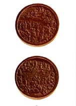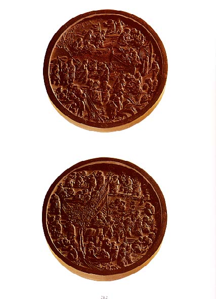 This is a round black inkcake carved on both sides with a motif of "Hundred Children at Play." At the edges there are two inscriptions, one reading "Ink from the first year of T'ien-ch'i period [A.D. 1621 ], from the collection of the Ts'ang-ts'ang Studio"; the other "Yeh Hsuan-ch'ing of Hsin-tu made this according to Li T'ing-kuei's method."
