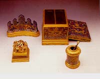 Thick and heavy, these writing materials are carved on their metal areas with passionflower patterns, and the bases are cast with the seal, "Manufactured during the Ch'ien-lung reign of the great Ch'ing dynasty." The cloisonne areas are elaborated with uniform lines and take dragons five claw as their main motif. With brilliant designs enhanced by bright, lustrous colors, this set of writing materials certainly exhibits the power and grandeur of an emperor.