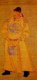 In this standing portrait the Emperor T'ai-tsung is depicted with black hat of silk, dressed in a yellow belted gown with narror sleeves. The Emperor bears a majestic look. The paiting is done in great details. It is truely a masterpiece of Chinese portrait painting.
